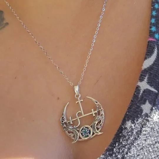 Ein traumhafter Kettenanhänger mit dem Symbol der GöttinGöttin Die Mutter-Göttin, "große Mutter" oder Fruchtbarkeitsgöttin schöpft und beschützt das Leben. Weiterlesen... Lilith im okkulten Vintage MondMond Der Mond steht für das Weibliche, die Nacht und für rhythmischen Wandel. Weiterlesen.... Die liegende Mondsichel trägt in ihrer Mitte ein kleines PentagrammPentagramm Das Pentagramm, auch Drudenfuß, Pentalpha oder Fünfstern genannt, ist ein uraltes Symbol der heiligen Geometrie. Weiterlesen... auf Perlmutt. Es bildet das Zentrum eines kleinen dreifaltigen Mondes – dem Symbol der Großen Weißen Mondgöttin.