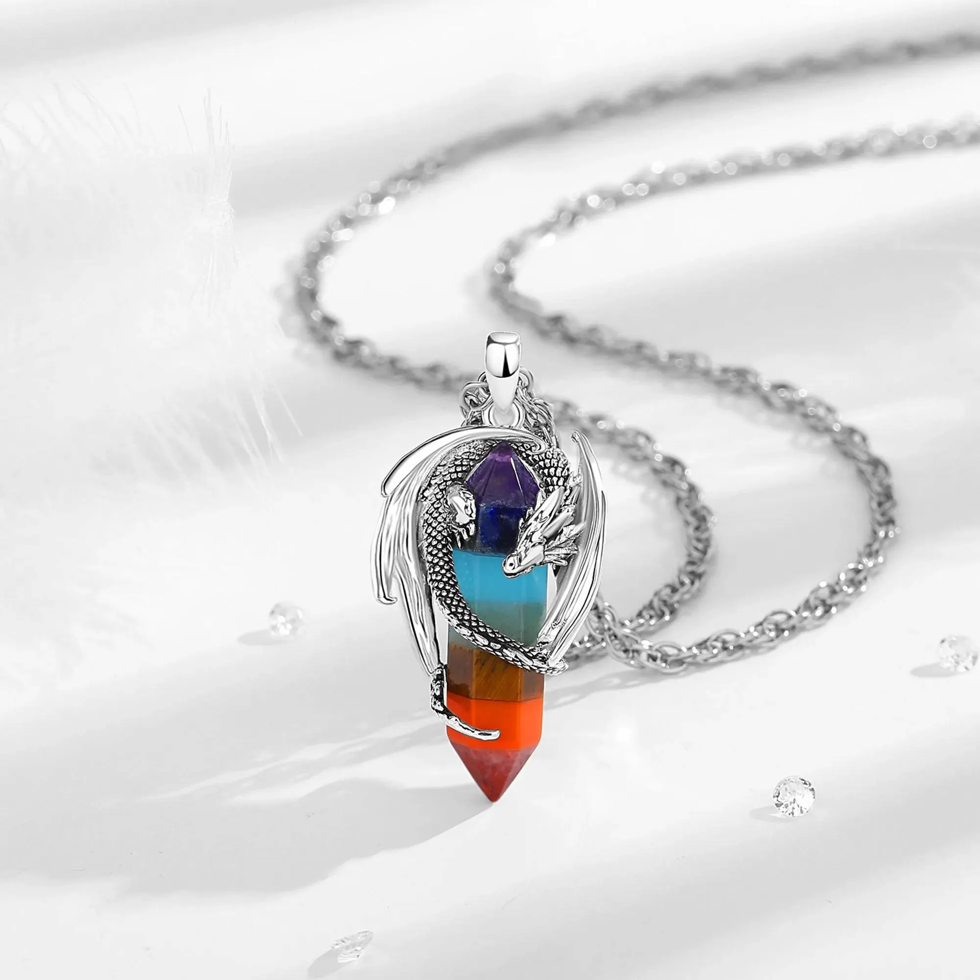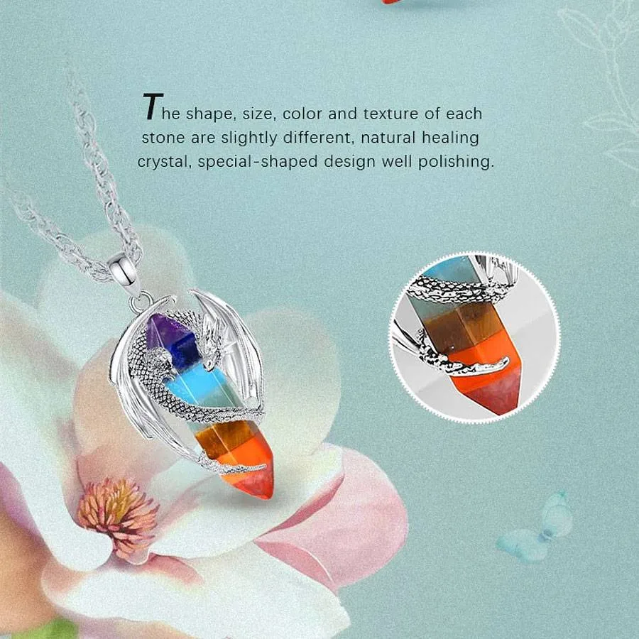 Silber Drache am Chakra Kristall, Chakren-Drachenschmuck Halskette | Edelstein Anhänger