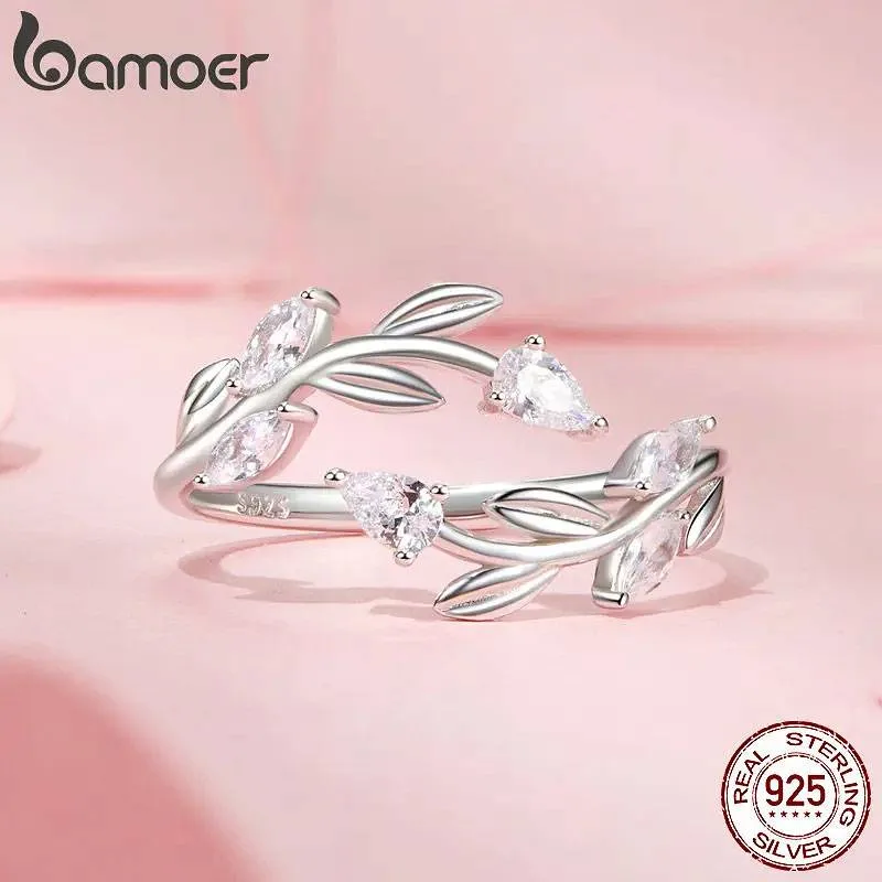 Ein eleganter offener Silberring mit kleinen Blättern, gefertigt von Bamoer aus echtem 925 Sterling Silber. Fünf der kleinen Fiederblätter glitzern aus klaren Zirkonia-Kristallen.