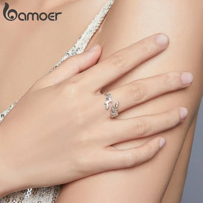 Naturdesign trifft Eleganz: Dieser offene Wrap-Ring von Bamoer formt sich aus zarten Silberblättern – wie eine Weizenähre oder ein Fiederblatt – besetzt mit funkelnden Zirkonia-Kristallen. Gefertigt aus 925er Sterlingsilber, romantisch und feminin.