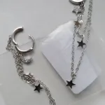 Die kleinen Klapp-Creolen tragen jeweils zwei unterschiedliche lange Ketten im Layering-Look, die mit drei Silbersternen verziert sind, ergänzt durch Mond oder Stern mit winzigem Kristall-Pavé. Das leichte Design ist über 6cm lang und setzt einen extravaganten Blickfang: ein Nachthimmel am Ohr, der bei jeder Bewegung schwingt und funkelt. Der Klappverschluss ist praktisch, die außergewöhnliche Länge sorgt für Gothic-Eleganz mit Raffinesse.