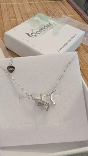 Dieses bezaubernde Stern-Collier vereint zwei offene Sterne, die symbolisch für ewige Verbundenheit stehen. Gefertigt aus hochwertigem 925 Sterling Silber, glänzt einer der Sterne in zeitlosem Silber, während der andere mit klaren Zirkonia-Kristallen besetzt ist und wunderbar funkelt.