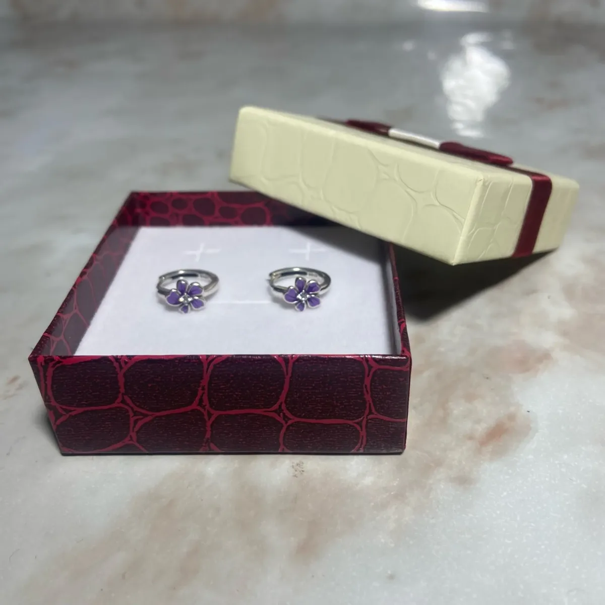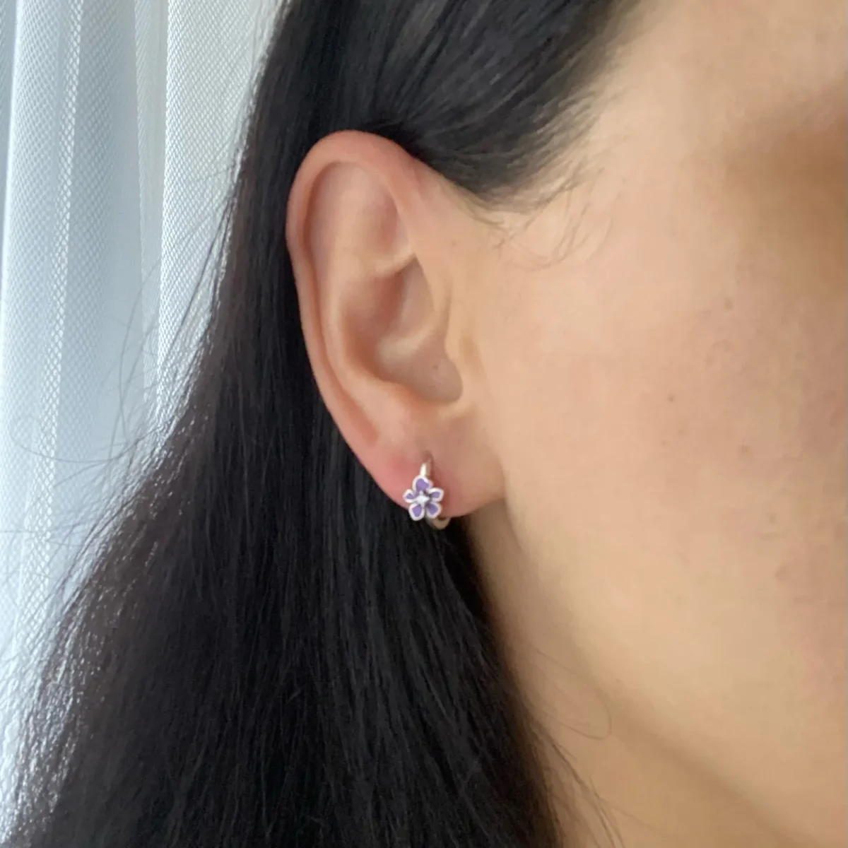 1 Rezension für Lila Blumen Creolen, Violette Blüten! Emaillierte Klappcreolen, auch für Mädchen | 925 Silber Ohrringe