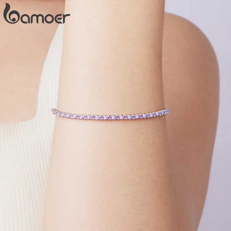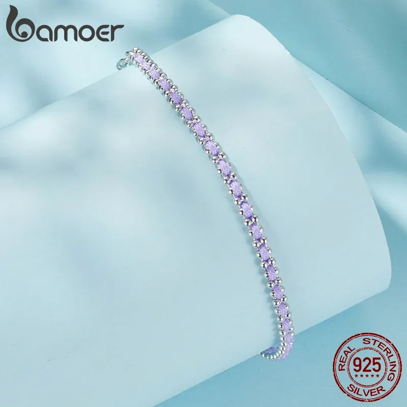 Silber trifft auf Textil: Dieses außergewöhnliche Armband von Bamoer verbindet zwei parallele Kugelketten aus 925 Sterling Silber mit einer violetten Baumwollschnur. Dieser kreative Materialmix vereint den eleganten Glanz des Edelmetalls mit weicher Flexibilität.