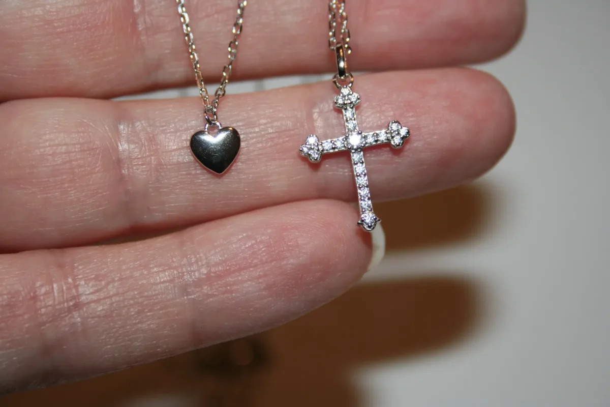 Diese zweireihige Halskette aus 925er Sterlingsilber verbindet ein zartes Herz mit einem Zirkonia-Kreuz. Die obere Kette trägt das Silberherz, darunter funkelt ein christliches Kleeblattkreuz mit den charakteristischen Dreiblatt-Enden. Liebe und Glaube in einem Schmuckstück.