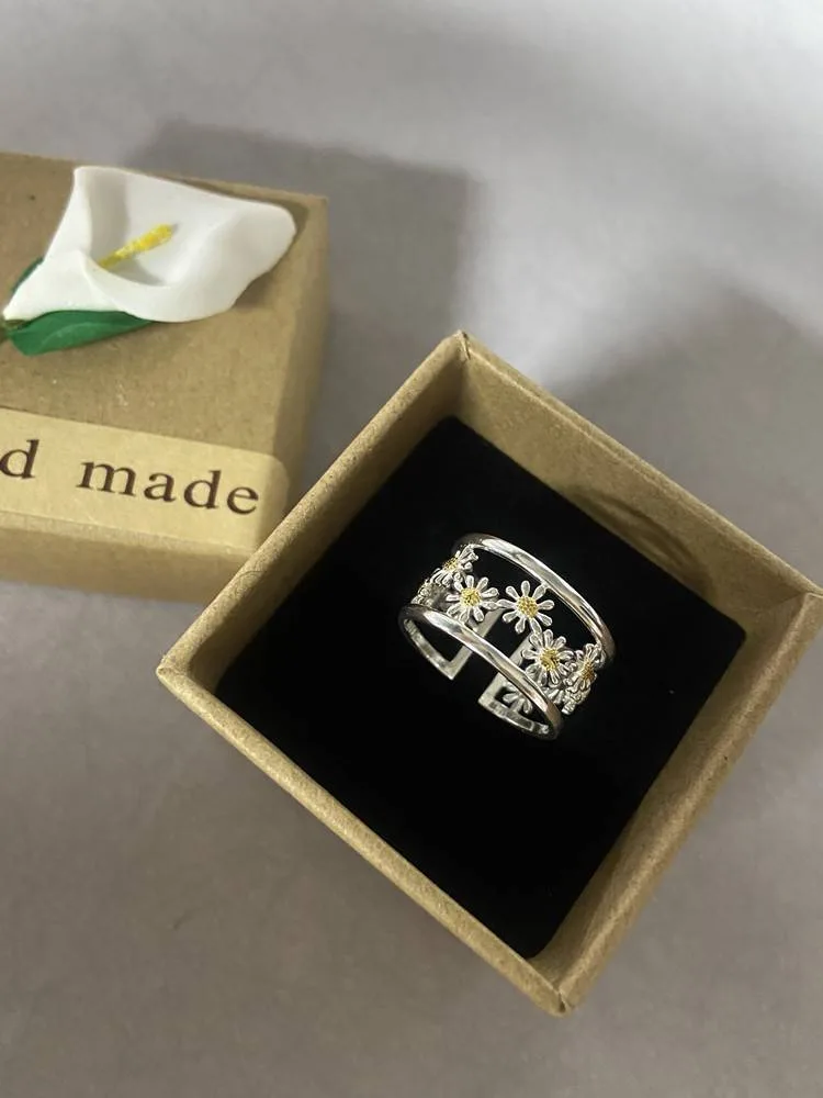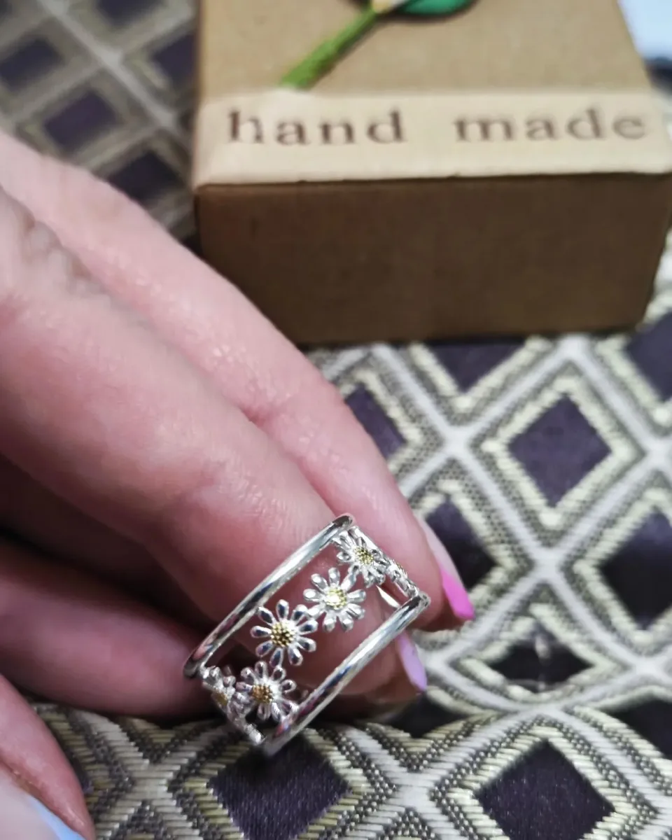 5 Rezensionen für Offener Gänseblümchen-Ring, Bicolor teilvergoldet, Breiter Bandring, Frühlings-Blüten | 925 Silber Ringe