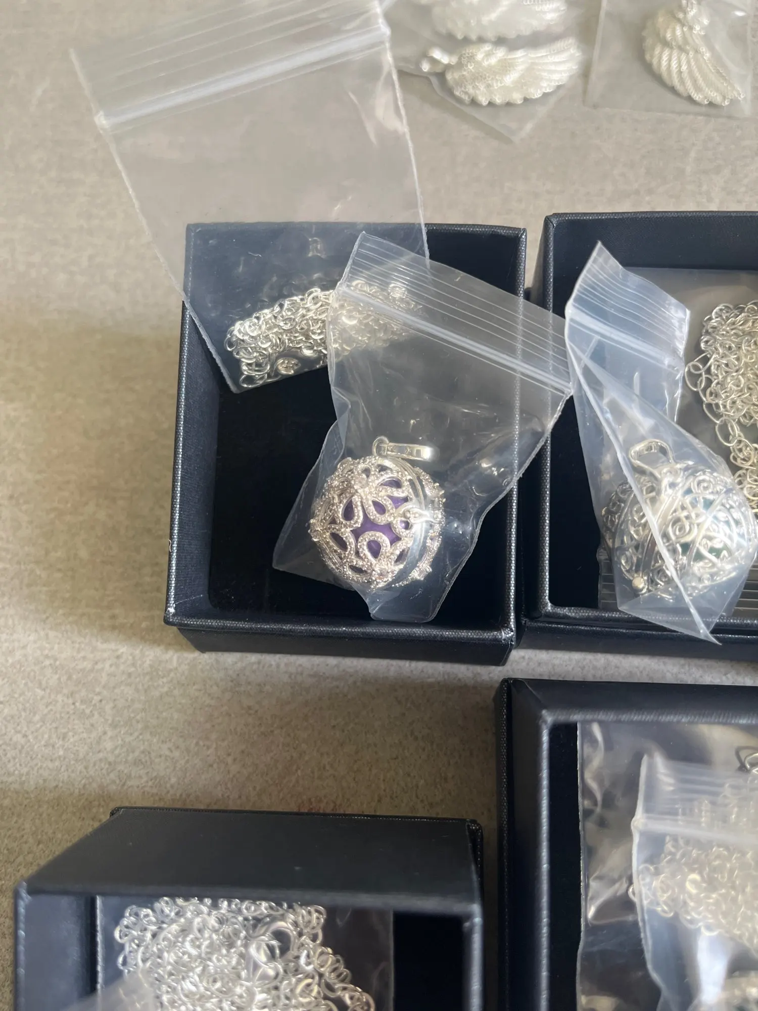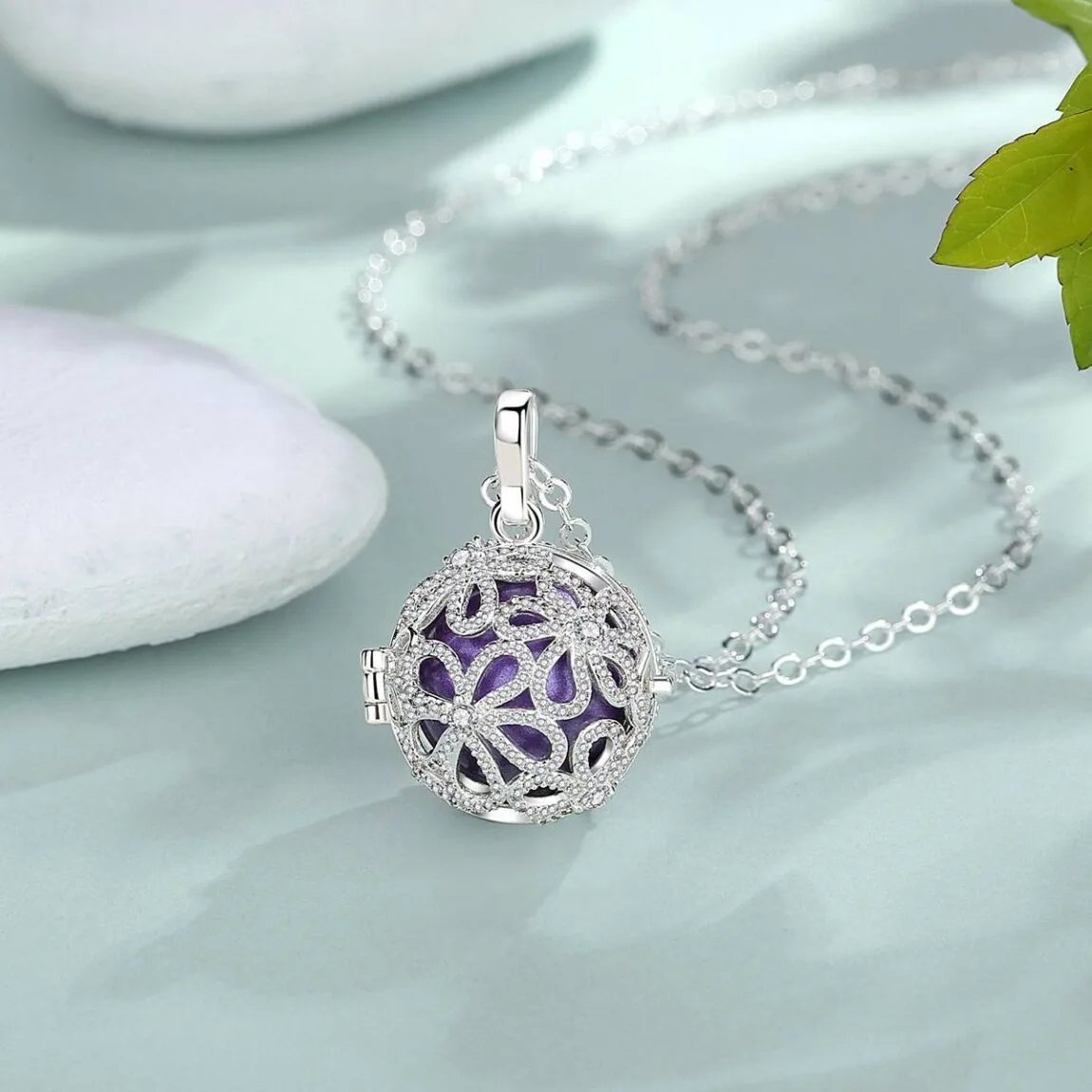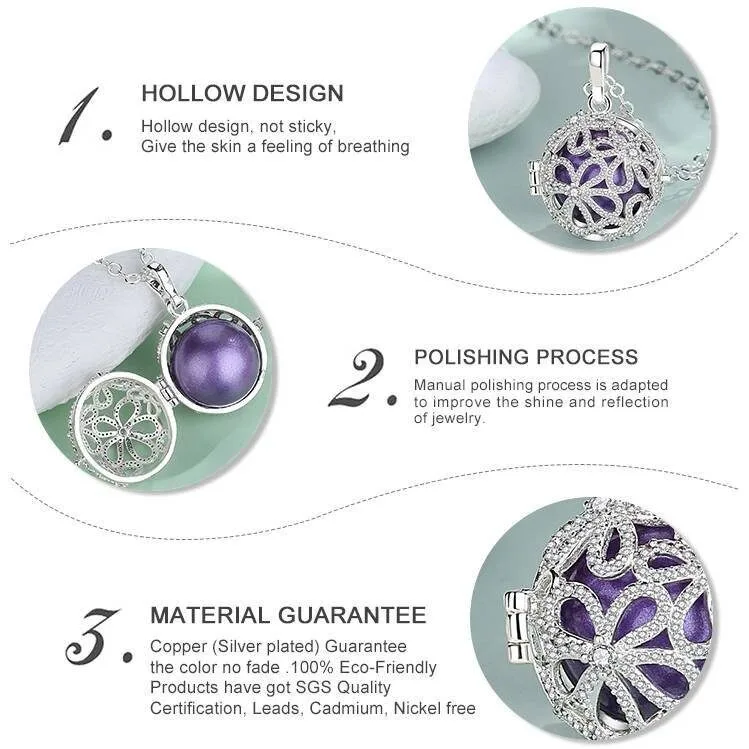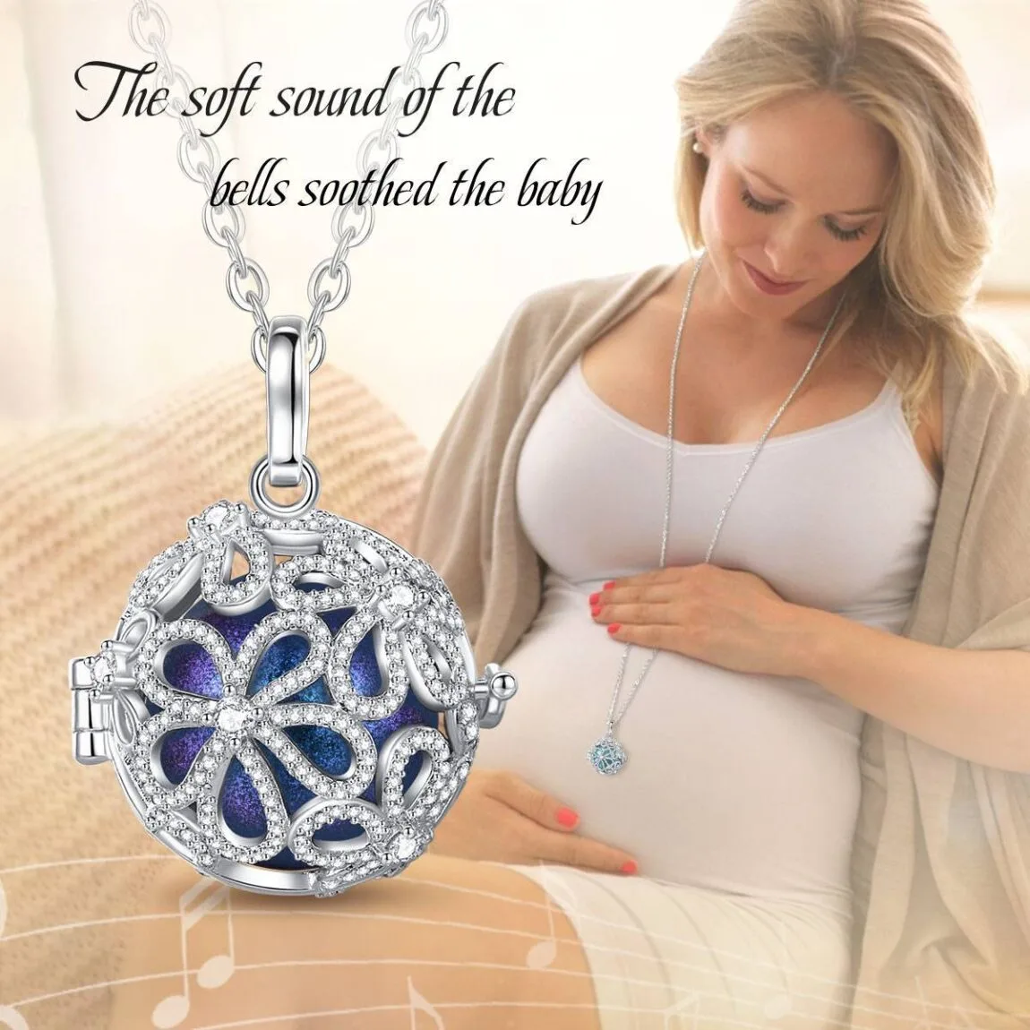Geliefert wird das funkelnde Käfig-Medaillon mit farbiger Klangkugel und langer Halskette in einer Schmuckbox. Der Blüten-Käfig kann auch leer, ohne Kugel, bestellt werden – für alle, die ihn selbst befüllen möchten. Auch als Geschenk zur Schwangerschaft geeignet.