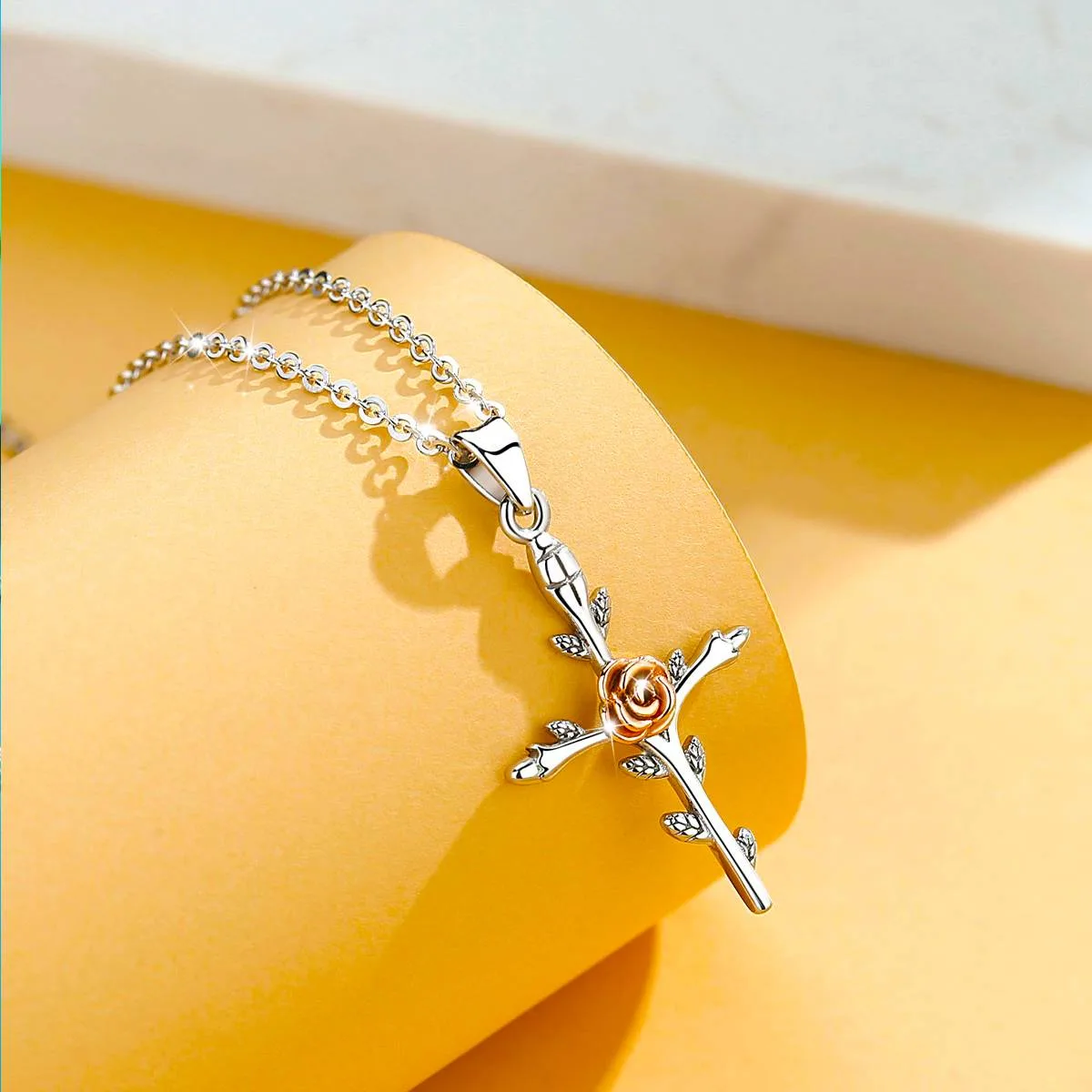 2 Rezensionen für Rosen-Kreuz, Christenkreuz Baum mit Rosé-Rose + Blättern, Rosenkreuz Halskette | 925 Silber Anhänger