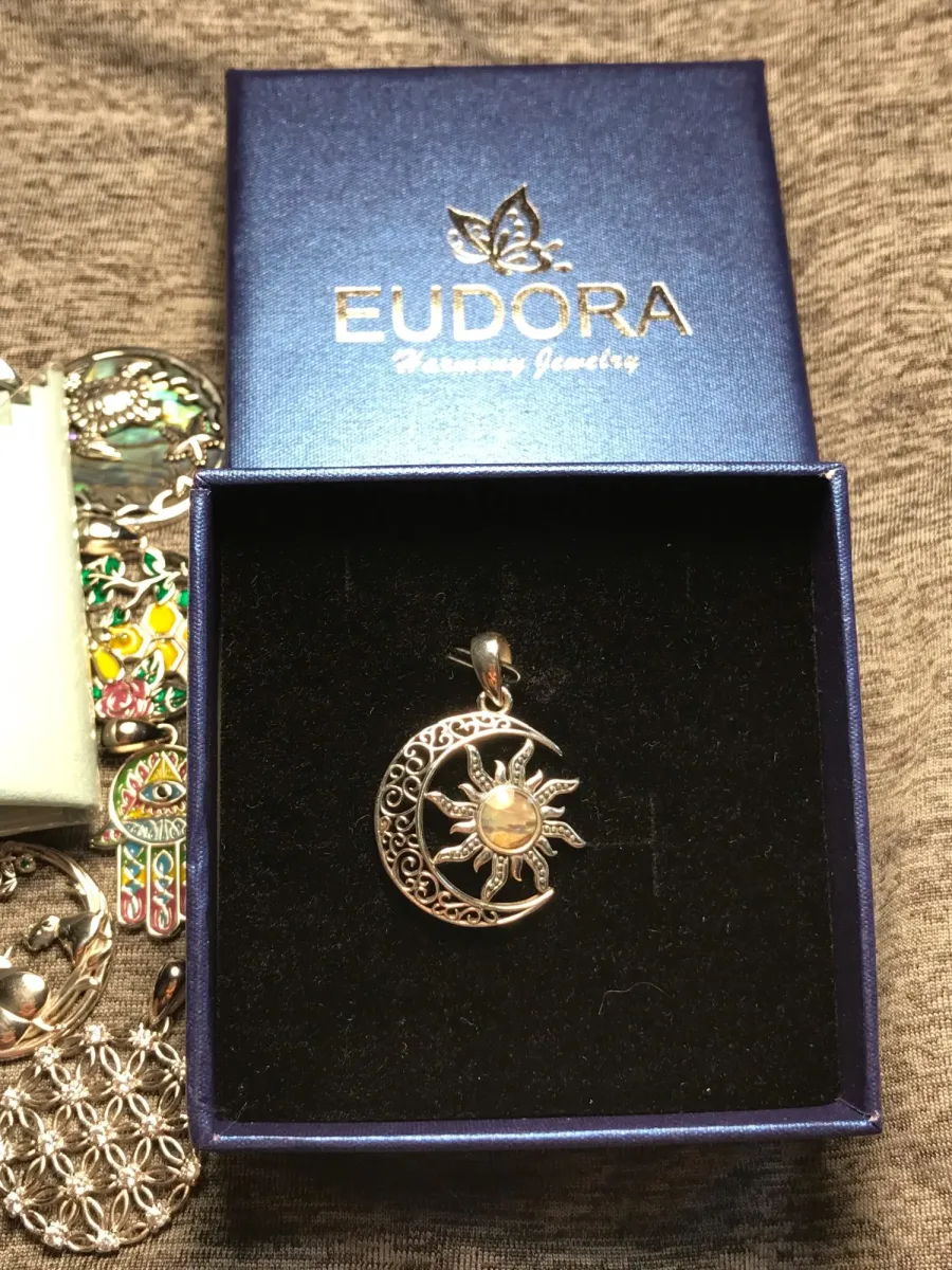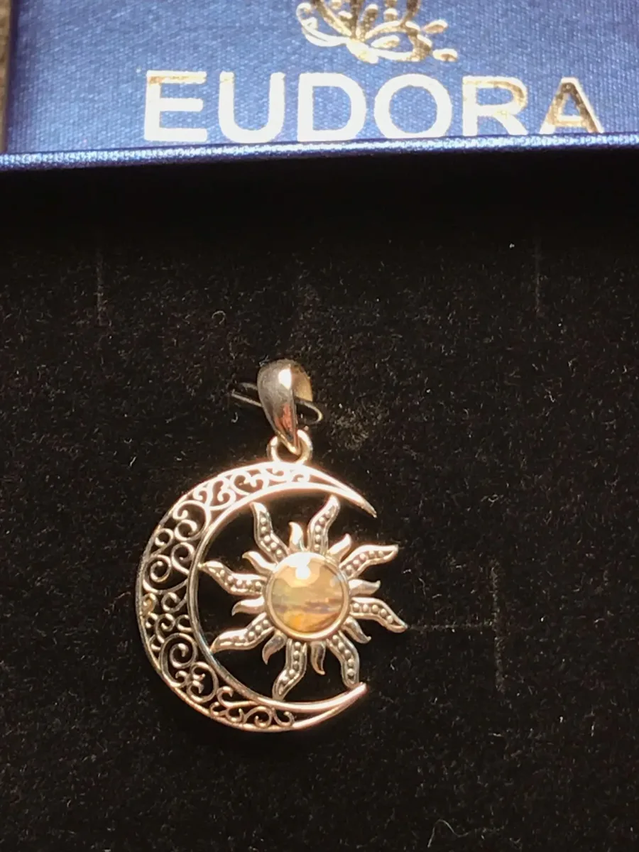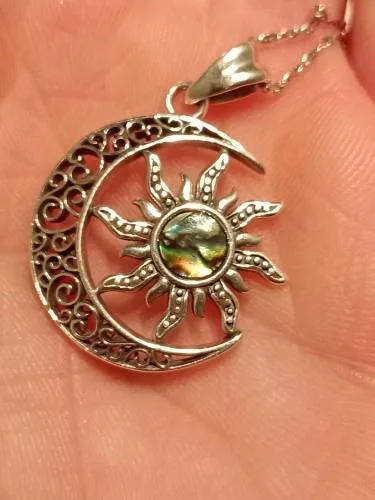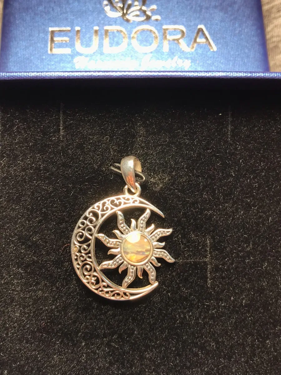 4 Rezensionen für Feurige Perlmutt Sonne im offenen Mond, mit Halskette | 925 Vintage Silber Anhänger
