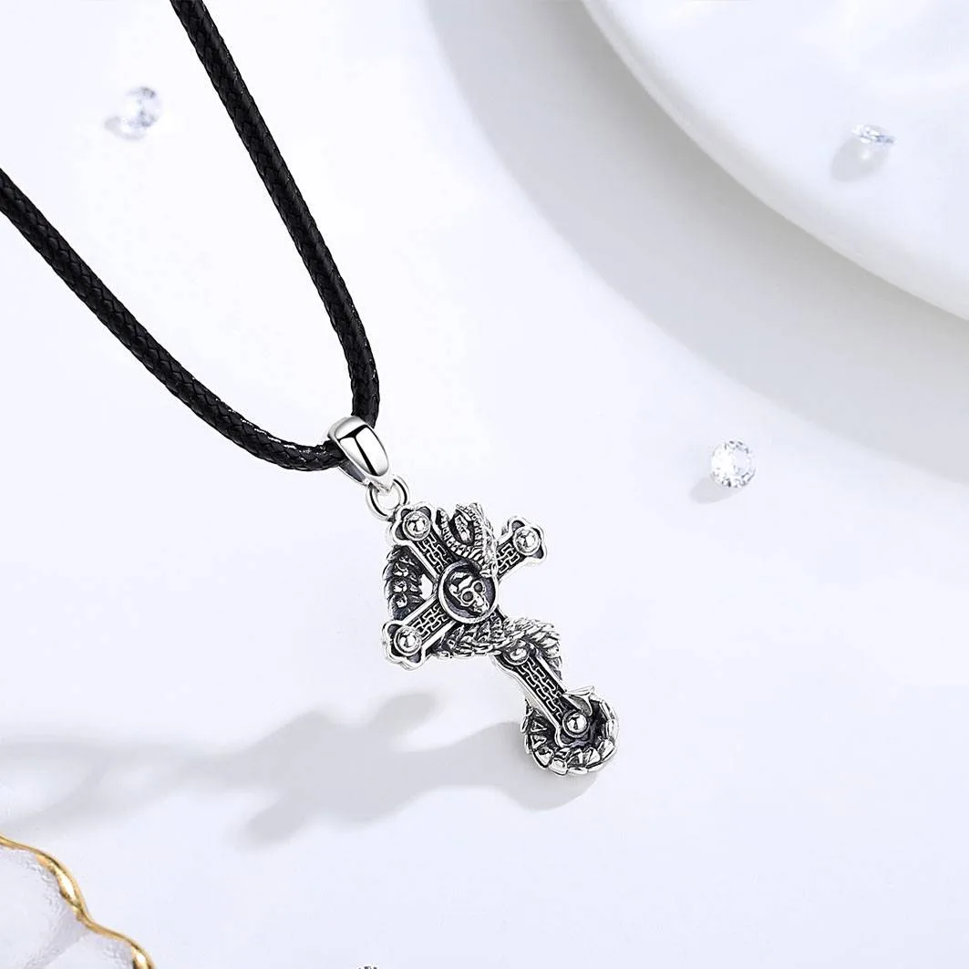 Drachenkreuz Halskette mit Totenkopf, 3D-Drache oder Schlange, Herren Biker Kreuz | 925 Silber Anhänger