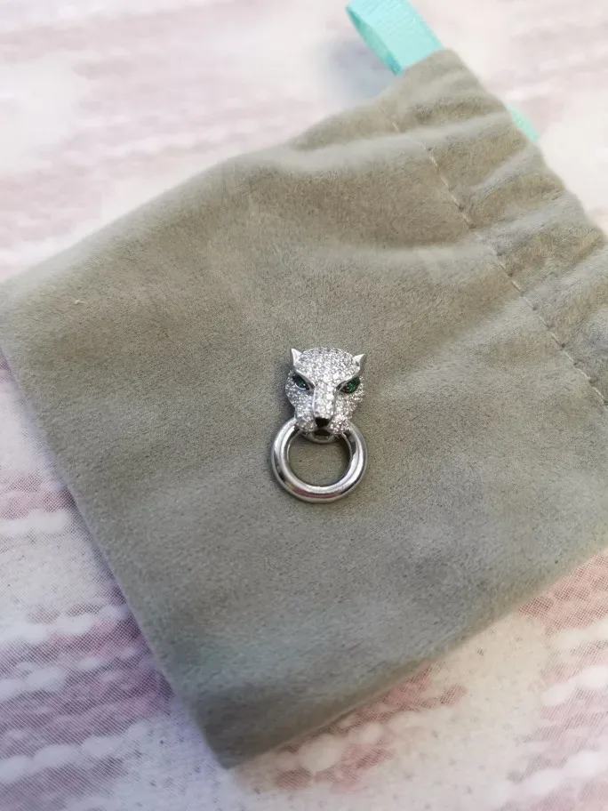 Dieser Leopard oder Pantherkopf funkelt aus einem Pavé von 71 Zirkonia-Kristallen! Im Maul ein polierter Silberring, durchdringende AugenAuge Augen gelten als das "Fenster zur Seele" und sind als Schmuck immer ein Blickfang! Weiterlesen... blicken aus grünem Spinell. Gefertigt aus 925er Sterlingsilber, schwebt das Floating Pendant elegant auf der Halskette.