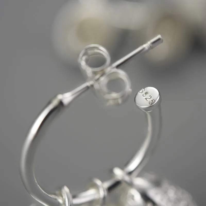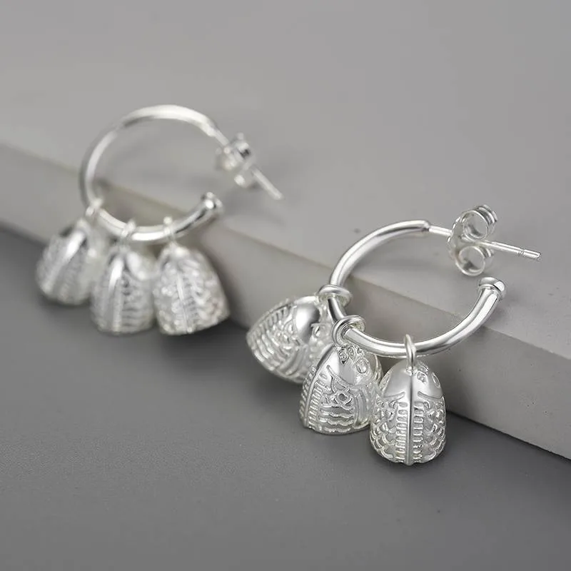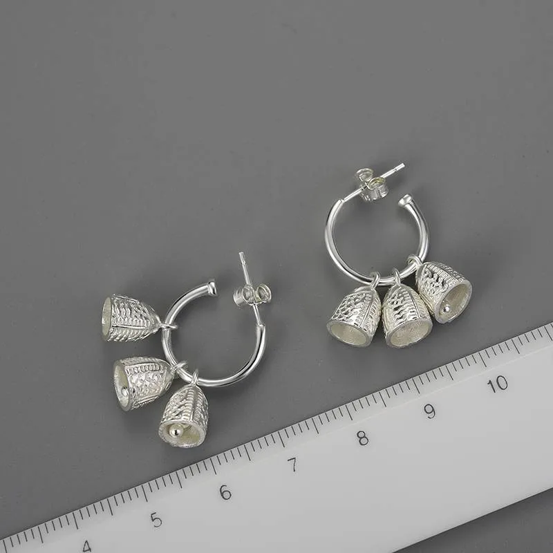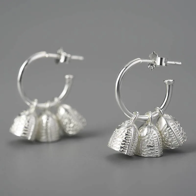 Drei kleine Fischglocken, fein graviert mit dem Relief buddhistischer Tempelkunst – aufgefädelt auf runde Halbcreolen aus 925er Sterlingsilber. Spiritueller Zen-Schmuck, der sich mit jeder Bewegung sanft entfaltet.