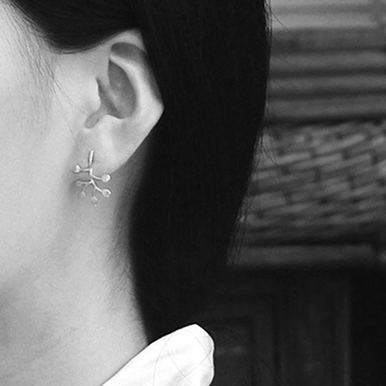 Sympathische Designer Ohrstecker aus einem organischen geometrischen Muster. Die geschwungene Form erinnert an die Saugnäpfe des Wilden Weins (Parthenocissus – Jungfernrebe) oder einen blätterlosen Baum mit großen Früchten. Die Oberfläche der kleinen Ohrhänger ist fein mattiert.