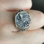 Ein breiter Vintage Silberring mit Wolf-Motiv und Odin’s Knoten. Das augenfällige Schmuckstück ist wie ein Siegelring gestaltet. Der fein gearbeitete Wolfskopf kommt leicht plastisch aus dem Kreis heraus. Die anfangs sehr breite Ringschiene trägt auf jeder Seite ein Valknut-Symbol (Odin’s Knoten).